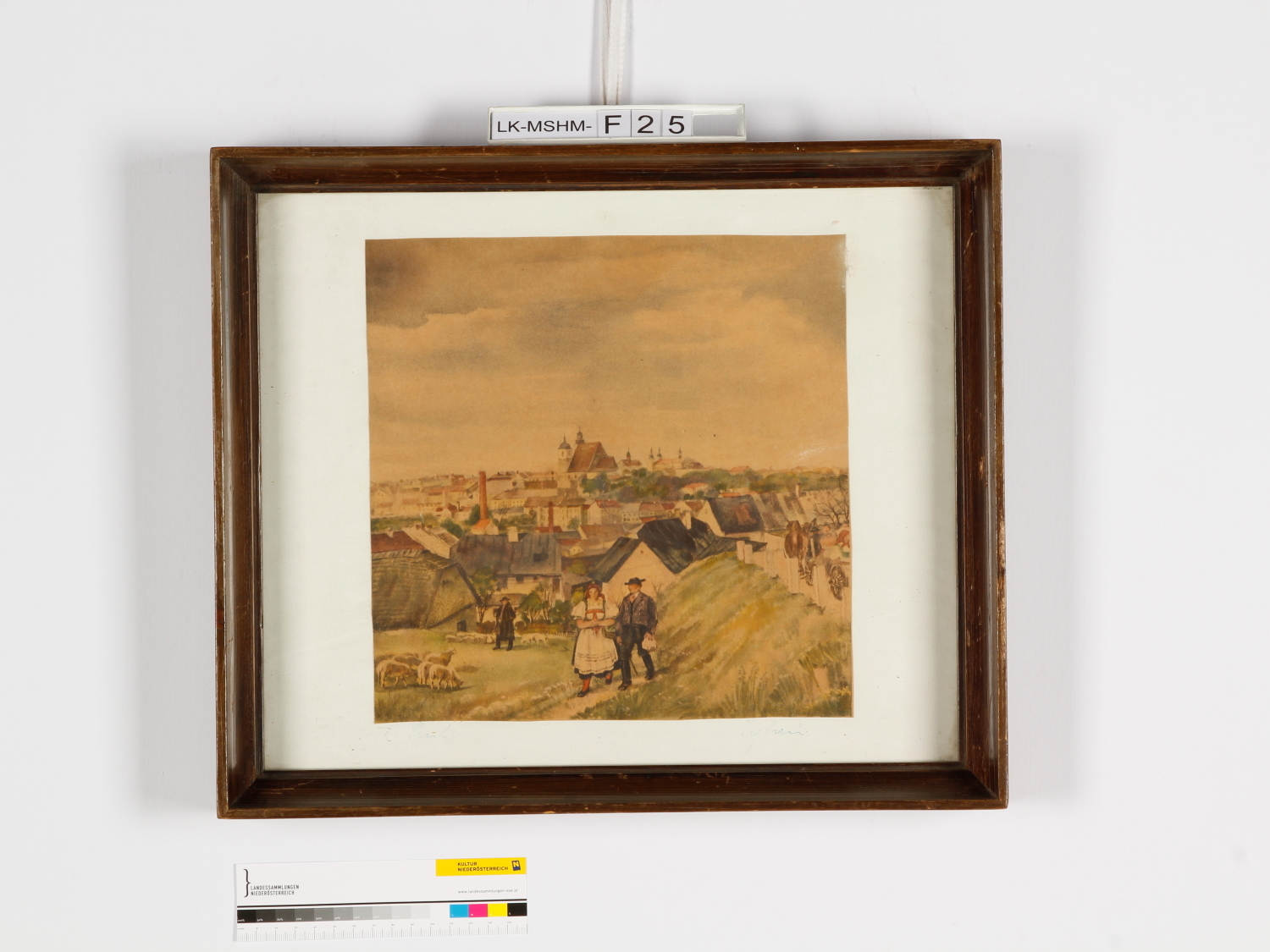 Stadtansicht Iglau, im Vordergrund ein Trachtenpaar