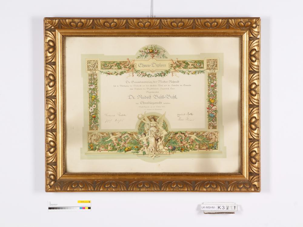 Ehrenbürgerurkunde der Markgemeinde Rosswald für Regierungsrat Dr. Rudolf Bastl-Bastl