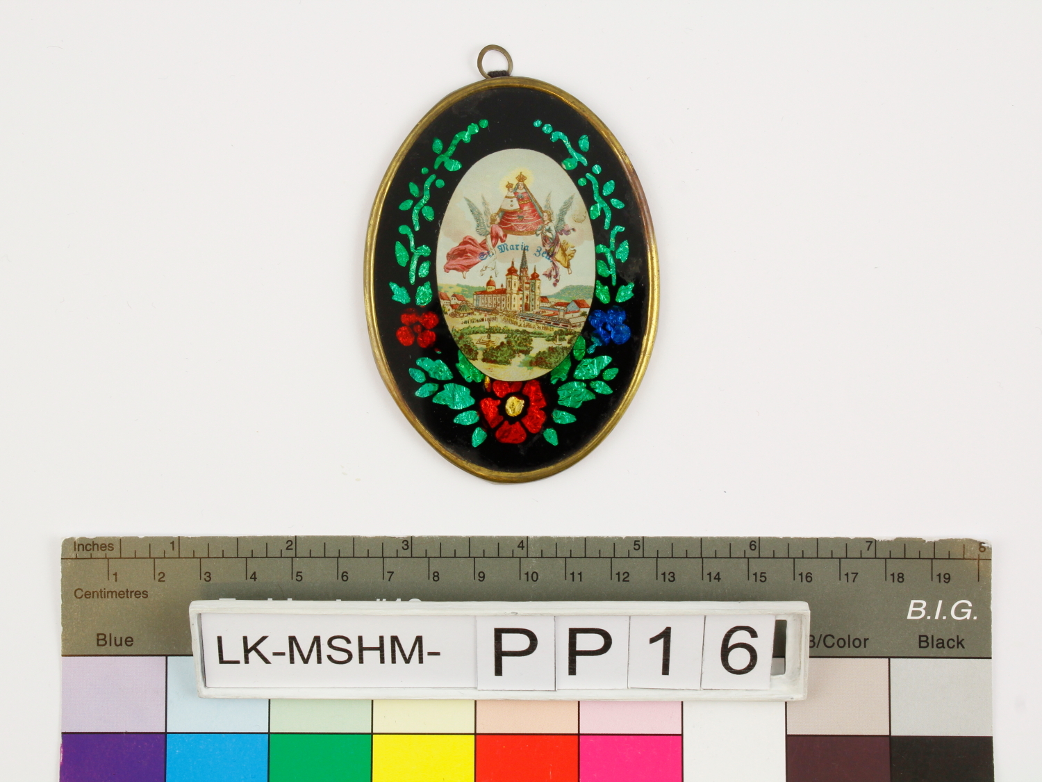 Andenkenbilchen mit der Basilika und heiligen Figuren umgeben von einer floralen gläsernen Einfassung.