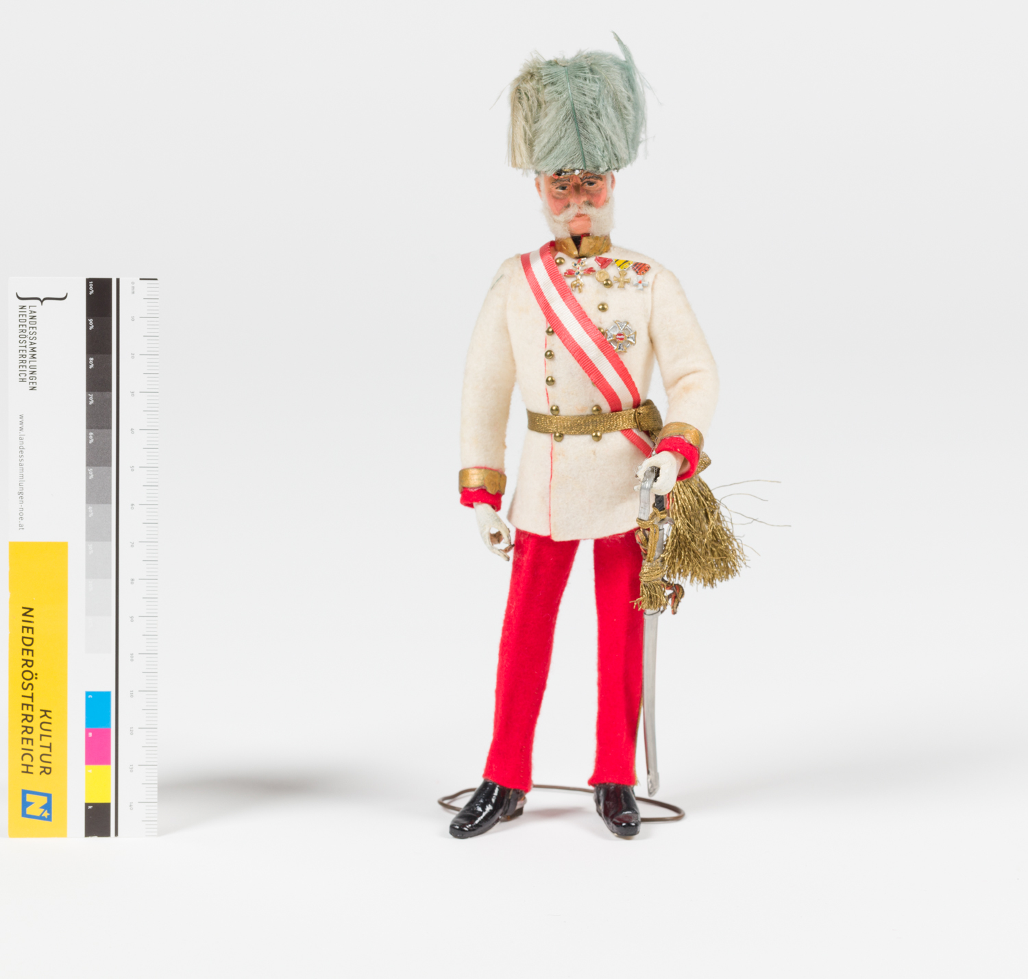 Die Figur zeigt den späten Kaiser Franz Joseph I. in Gala-Uniform eines österreichischen Feldmarschalls in deutscher Adjustierung.