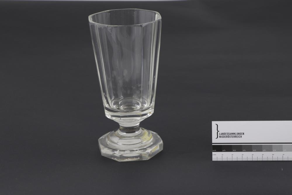 4 runde Kelche mit kurzem Stiel und rundem Standfuß. Glas farblos, transparent. Geschliffenes Dekor. Verwendung vermutlich für Kaffee.