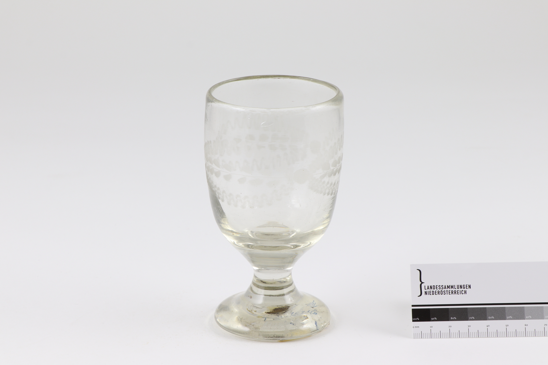Rundes Teeglas mit leicht gebauchter Wandung. Vegetabiles Ornament graviert.
