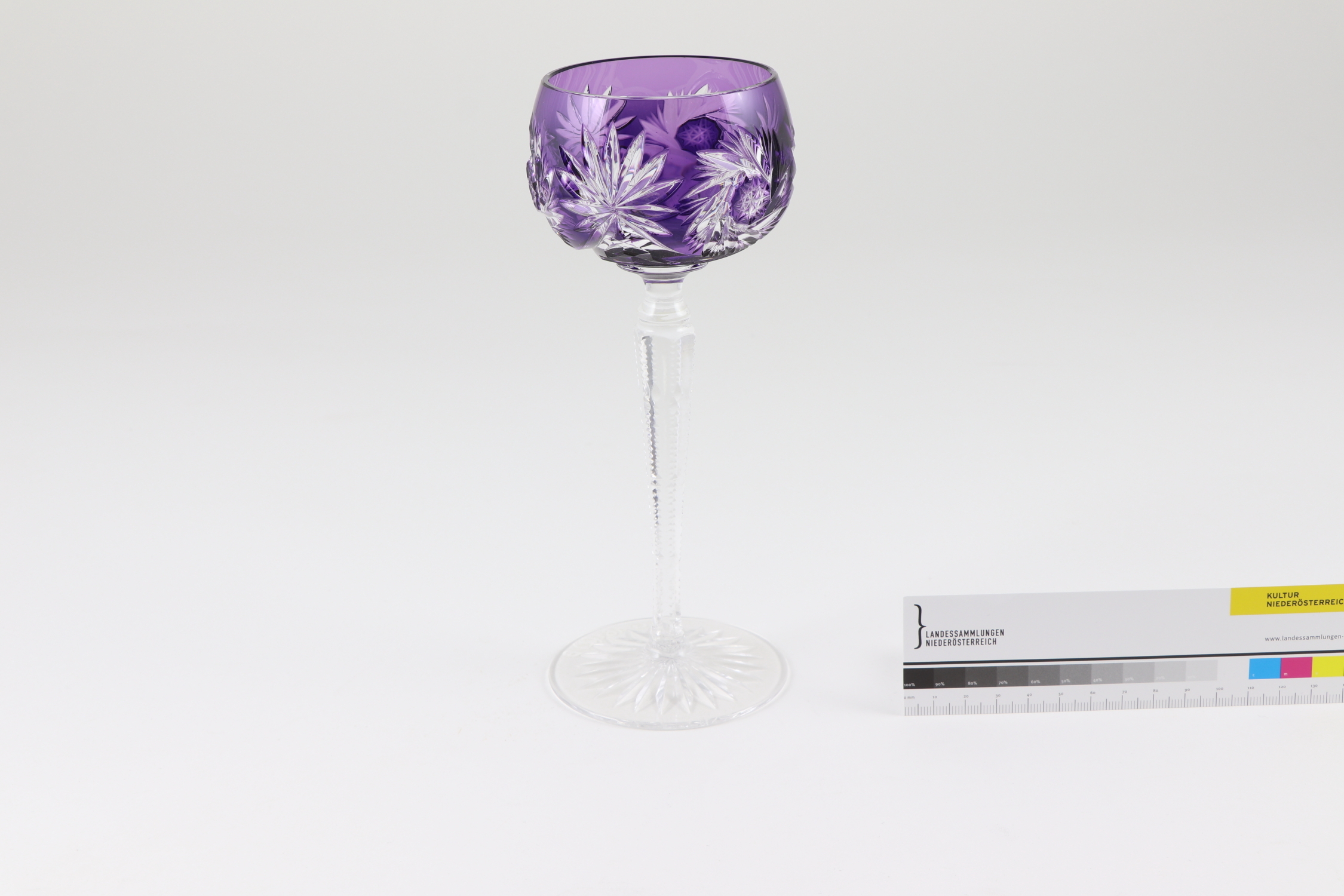 Rundes Weinglas mit sechspassig geschliffenem Stiel. Kuppa in Violett überfangen. Geometrischer Dekor geschliffen und flammpoliert.