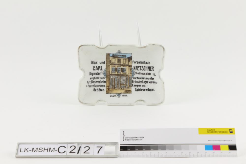 Rechteckiger Aschenbecher. Motiv (Geschäftsniederlage Karl Kretschmar Rathausplatz 15 in Jägerndorf) und Aufschrift in Schwarz, Blau und Ocker umgedruckt.