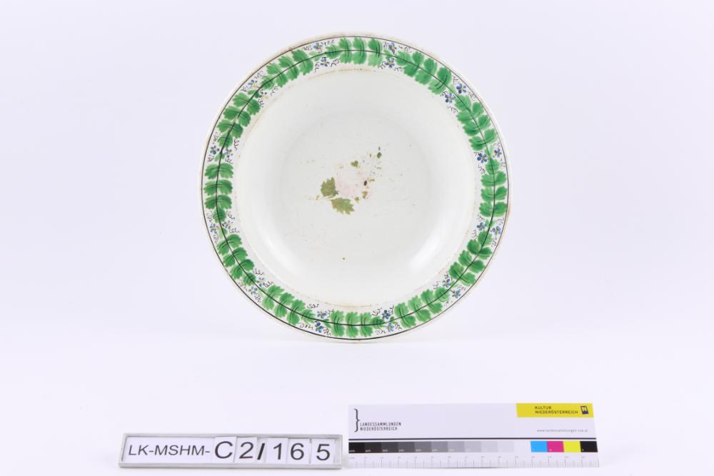 Runder Suppenteller. Vegetabiler Dekort in Schwarz (Schwarzlot), Grün, Blau und Gelb gemalt.