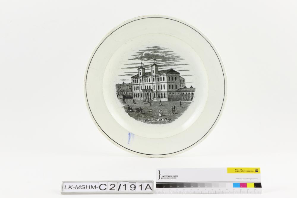 Runder Teller. Motiv (Bahnhof in Pragf) in Schwarz umgedruckt. Linearer Dekor in Schwarz gemalt.