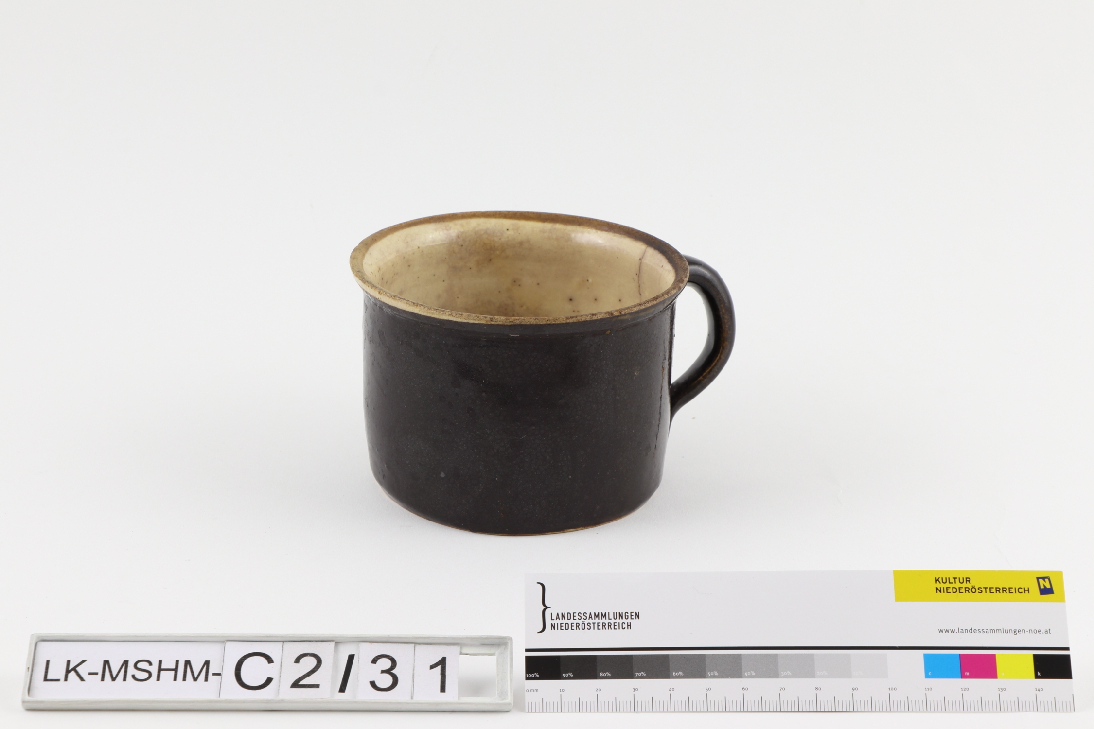 Konisch-/ zylindrischer Topf mit 1 unterrandständigen, c-förmigen Henkel. Glasur außen dunkelbraun, innen beige. Ausgestellter Rand. Fassungsvermögen ca. 0,5 Liter.