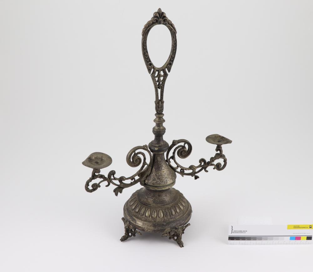 Zweiflammiger Kerzenhalter mit Handhabe und flachen Tüllen.