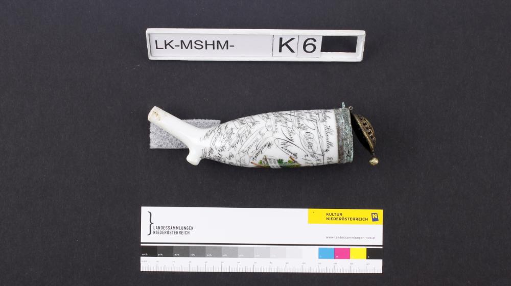 Pfeifenkopf mit Autogrammen der Studienkollegen des Guido Drechsler in Schwarzlot gemalt. Motiv (Forstwerkzeuge vor Eichenlaub und Tannzweigen) in Schwarz umgedruckt und in Blau, grün, Ocker und Braun bemalt. Beschläge aus vernickeltem Messing.