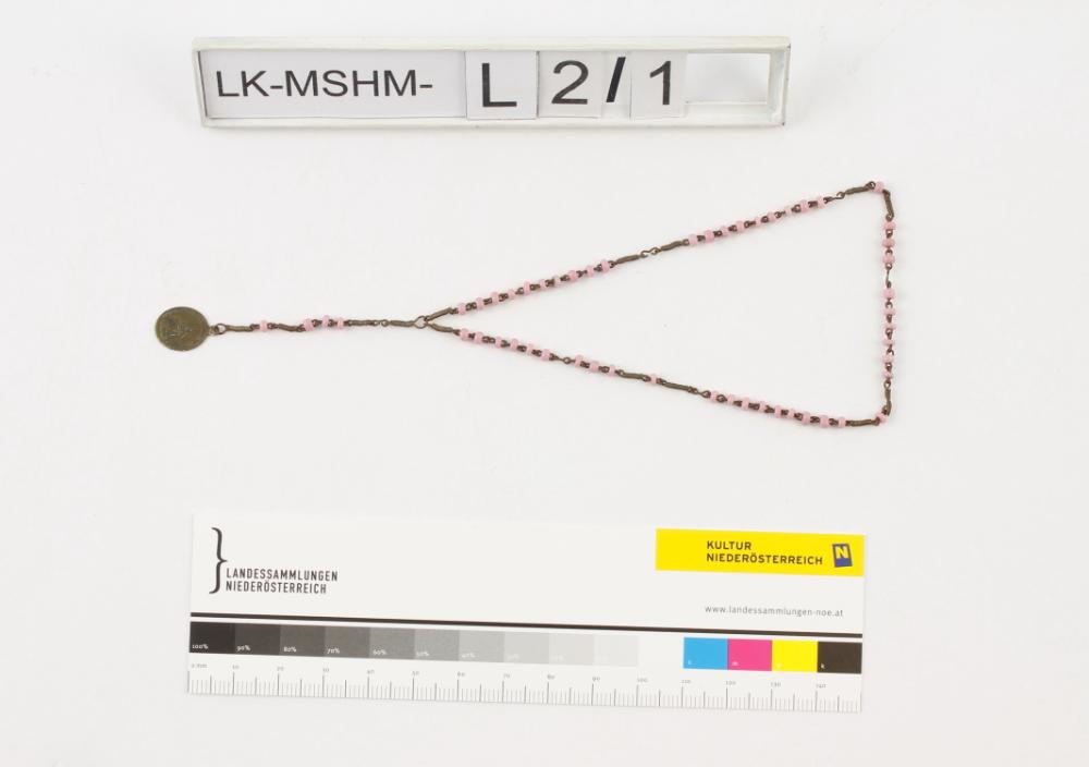 Rosenkranz mit Andachtsanhänger, Darstellung eines Kirchengebäudes und eines Gnadenbildes.