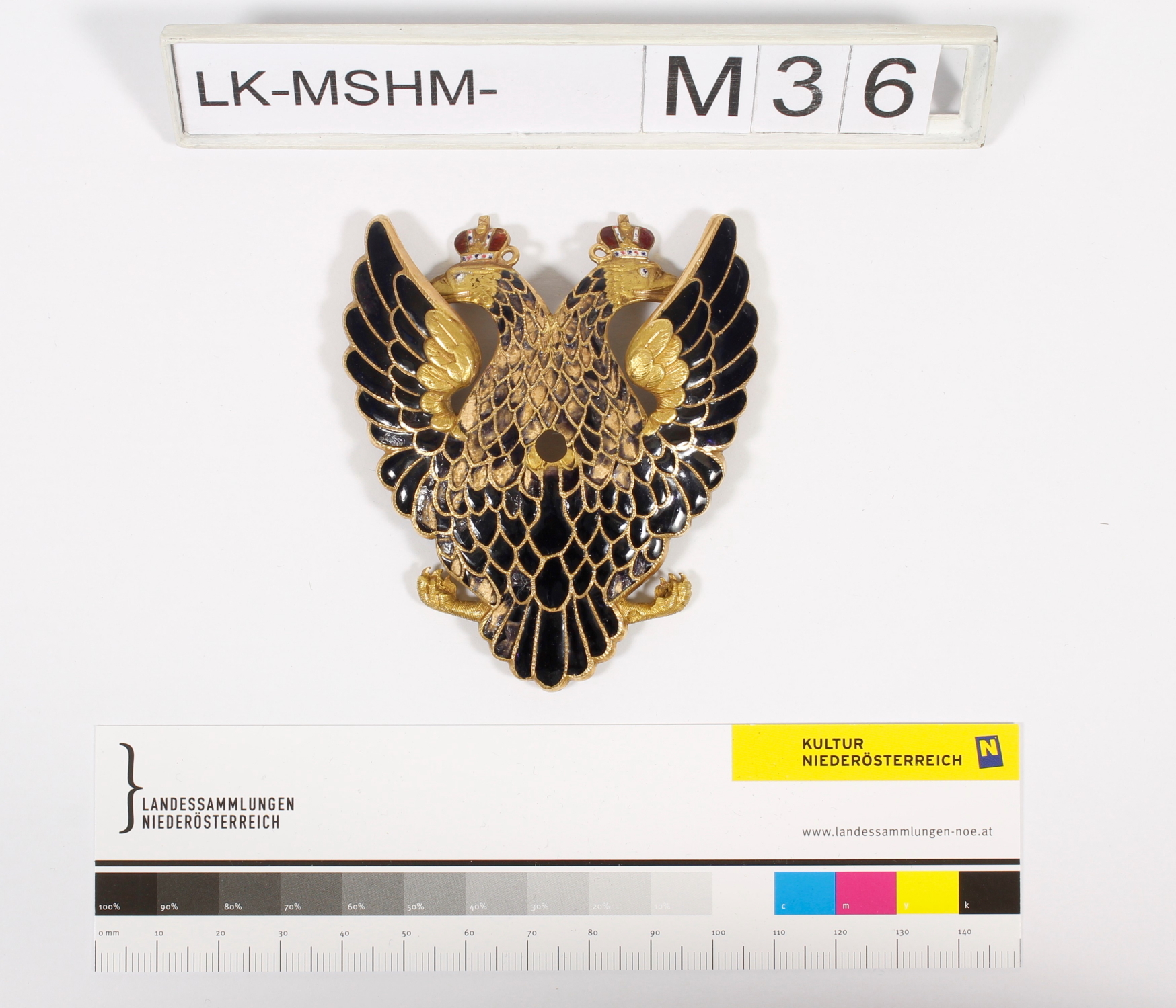 Fragment eines Wappenkleinods aus dünnem Goldblech getrieben, Gefieder des Adlers in opak schwarzem Cloisonné-Email, Augen und Kronen Email en ronde bosse in Weiß, transluzid blau und transluzid rot gemalt.