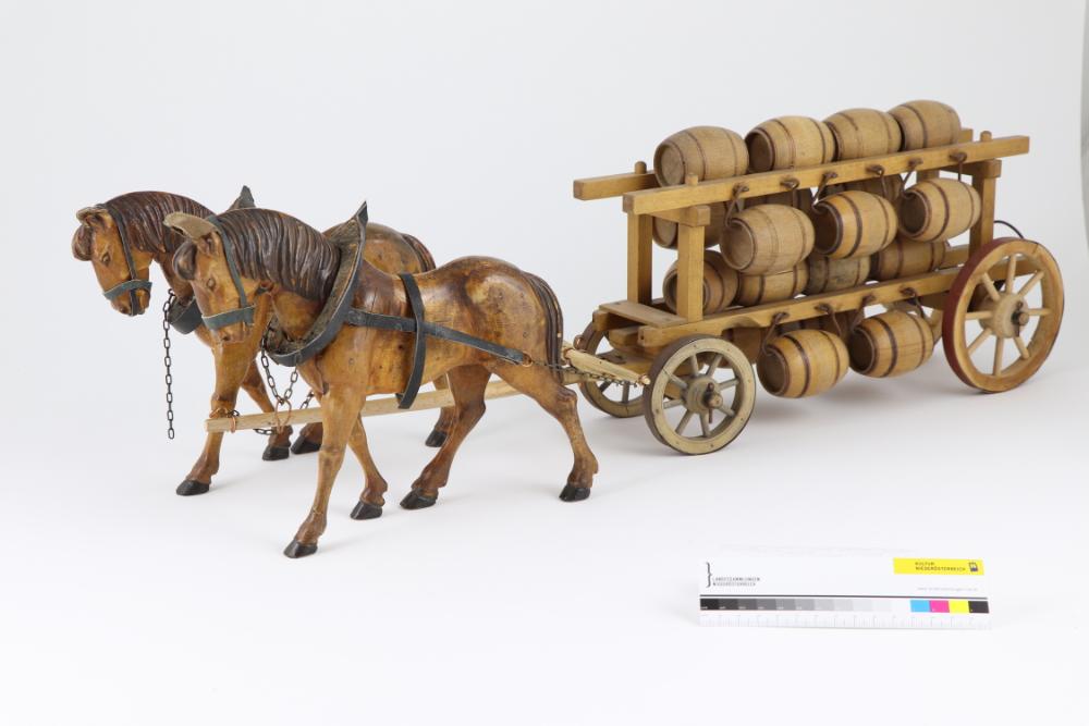 Kinderspielzeug aus dem Hause Flemmich, Römerstadt um 1885, Pferde neu gemacht für die Enkel. Restauriert von Prof. Walter Schwarzl, 1994.