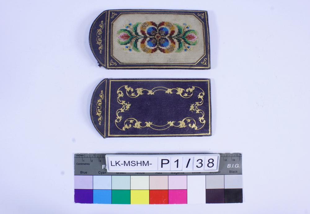 Schiebeetui, vermutlich für eine Sehhilfe. Leder mit reicher Goldprägung und Petit-Point-Stickerei mit facettierten Goldglasperlen.