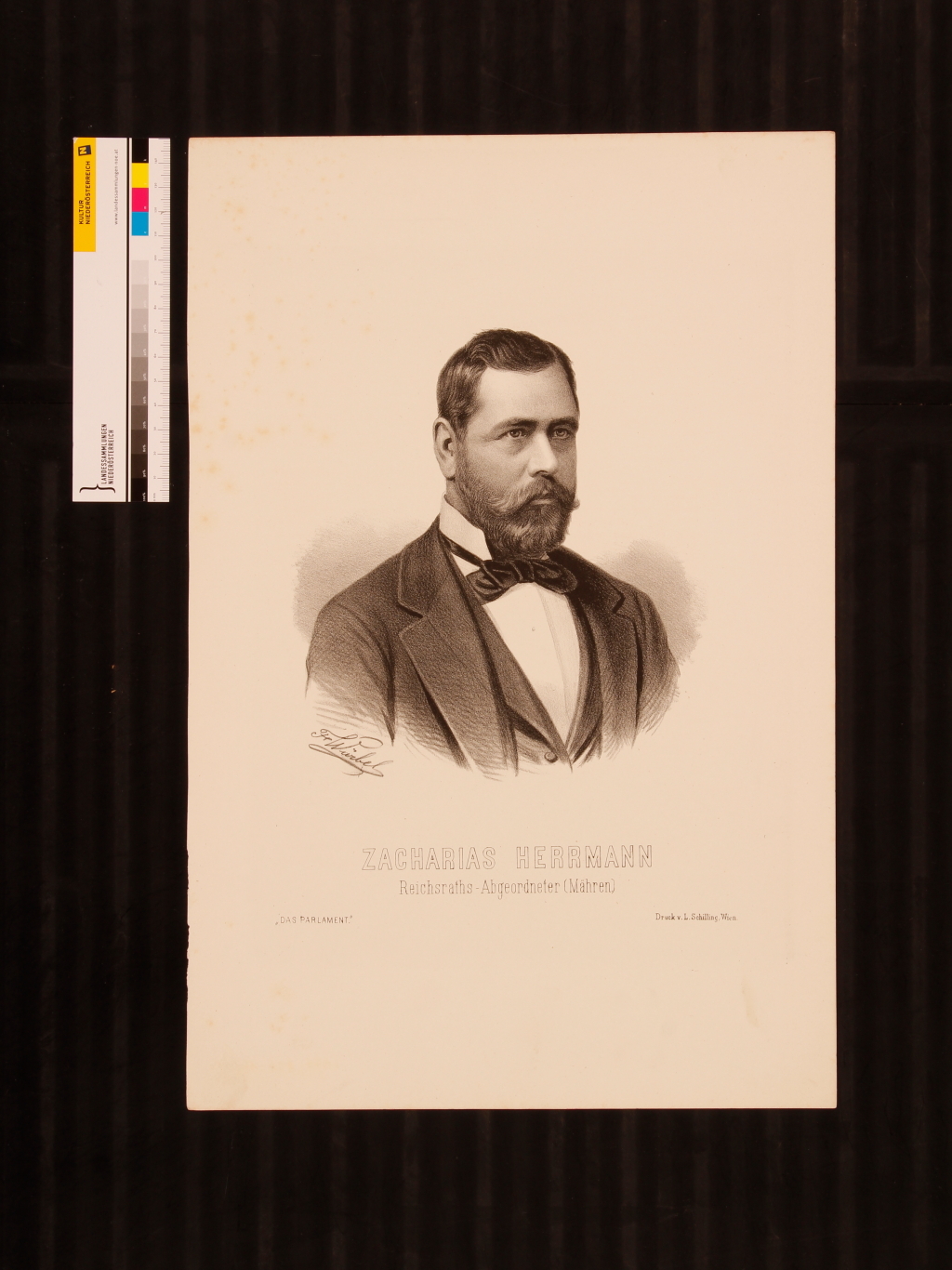 Zacharias Herrmann (1834-1896) Reichsratsabgeordneter aus Mähren. Druck von J. Schilling, Wien. Lithographie F. Würbely. Aus der Reihe "Das Parlament".