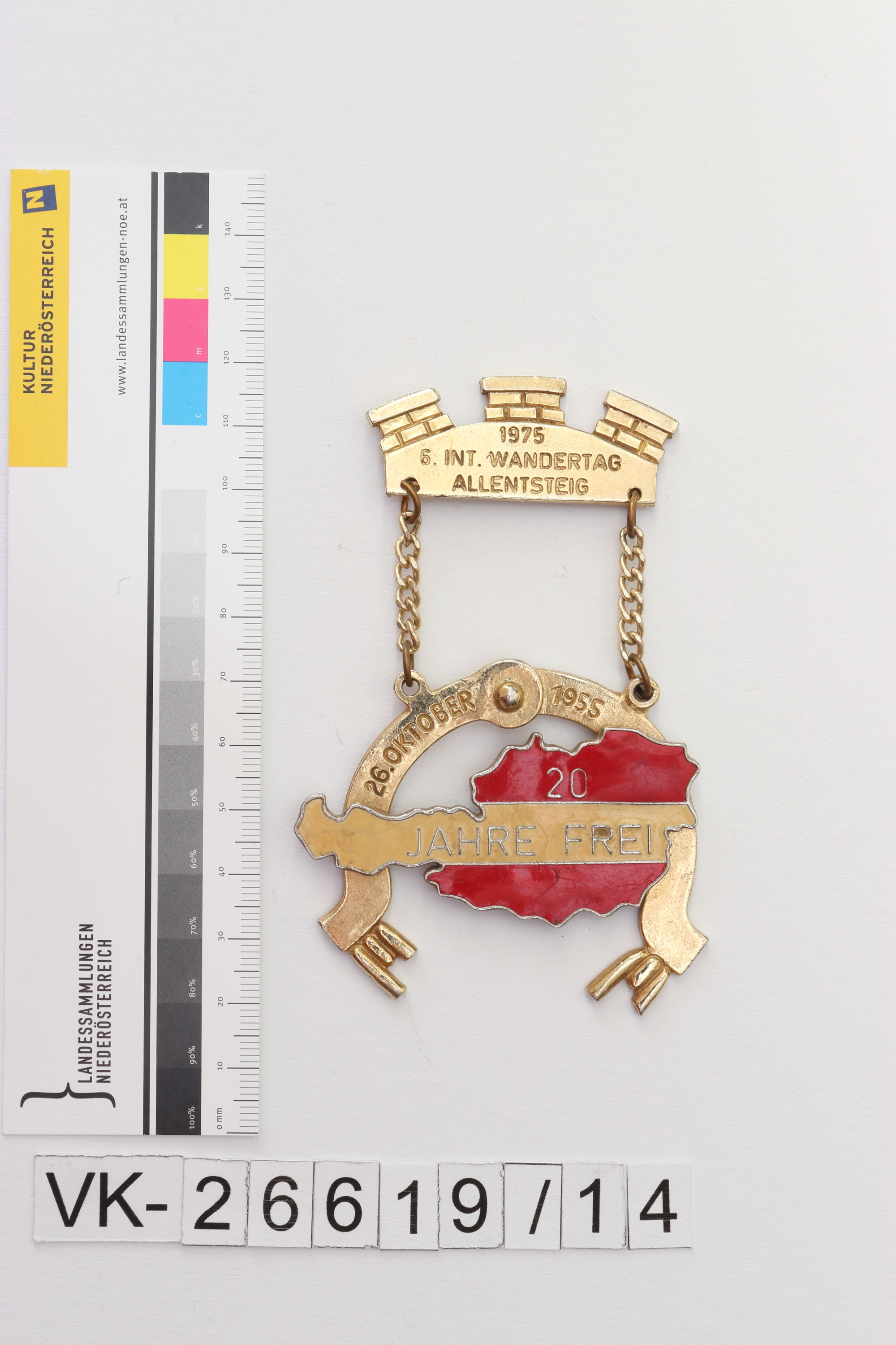 Abzeichen an einem Kettchen mit einer Österreich-Darstellung und Beschriftungen: "1975 6. INT. WANDERTAG ALLENTSTEIG", "26. OKTOBER 1955", "20 JAHRE FREI".