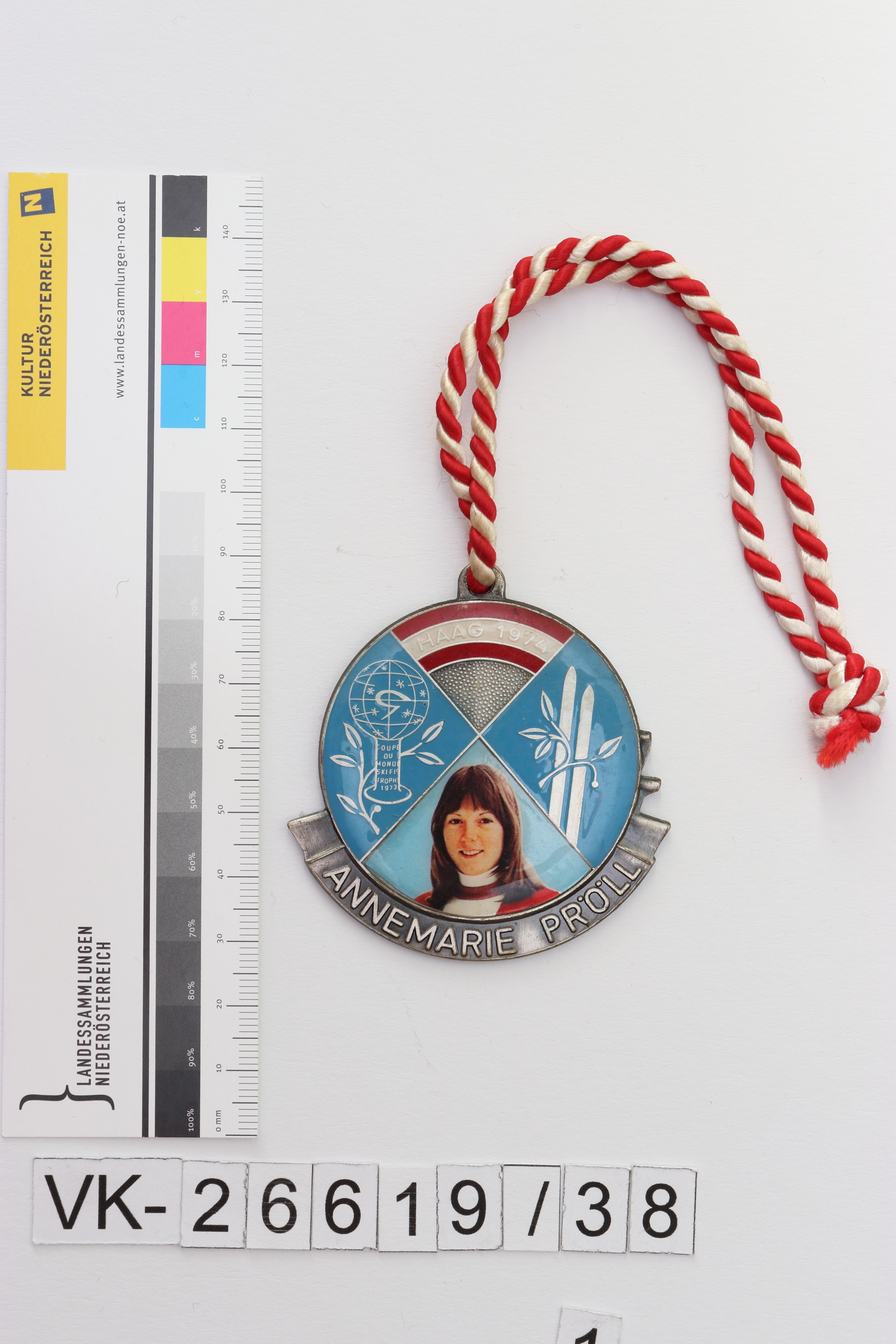 Abzeichen mit Kordel; in Segmenten sind Darstellungen angebracht: Pokal, Schi, Protraitfoto. Beschriftungen: "Haag 1974", "ANNEMARIE PRÖLL".