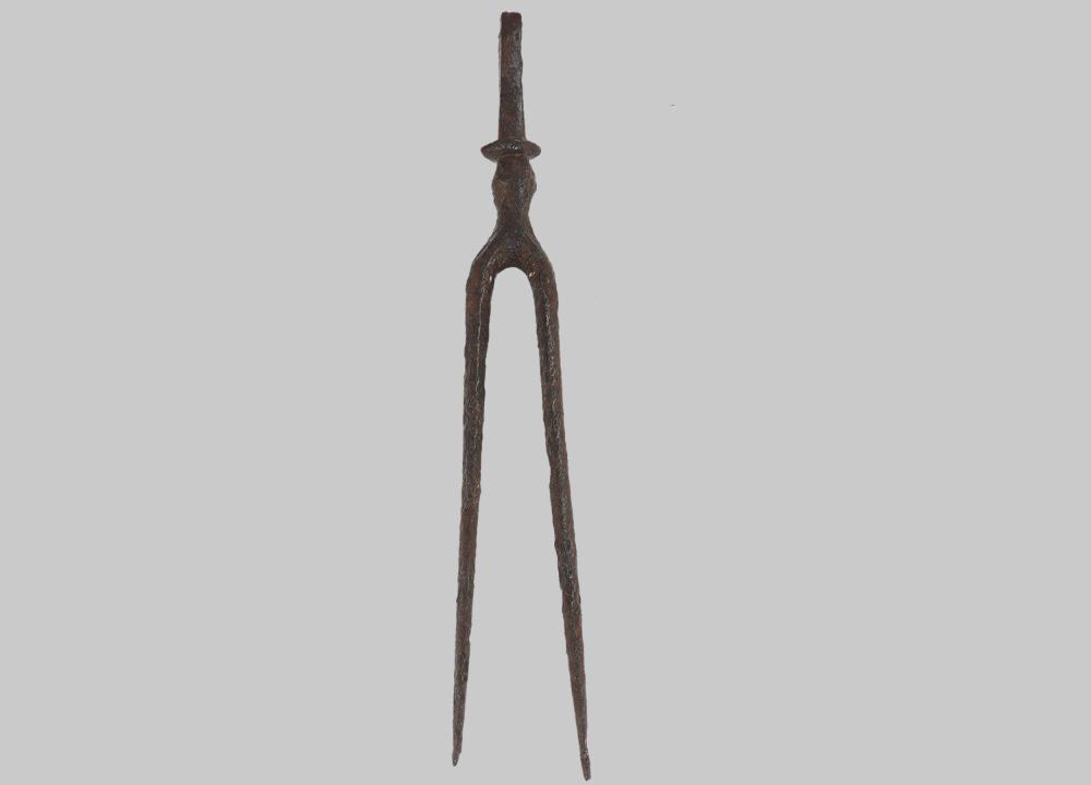 Zweizinkig. Kurzer profilierter Stiel. Scheibenförmiges Zwischenstück am Übergang zum Griffdorn.