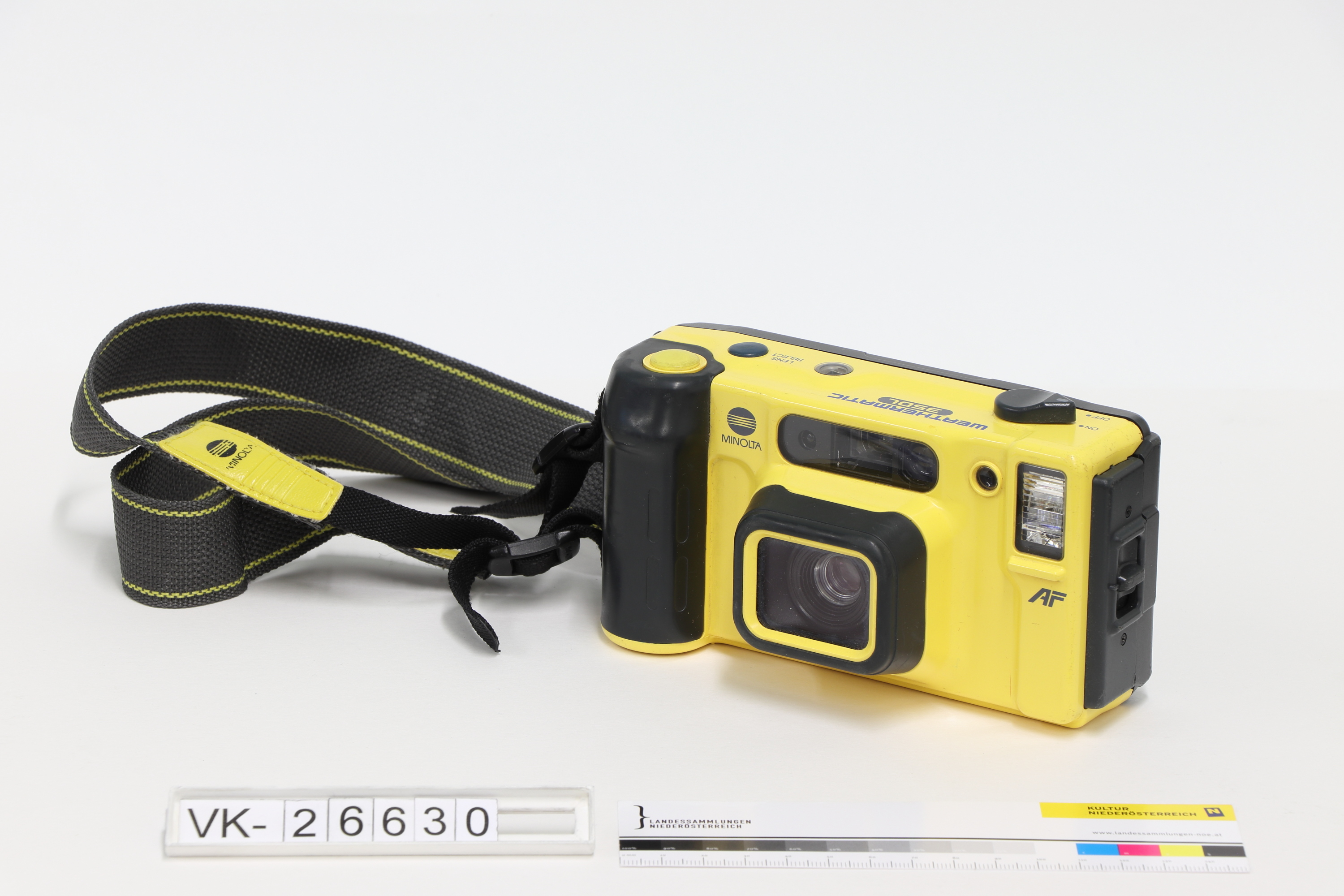Unterwasser-Kleinbildkamera (Sucherkamera) "MINOLTA WEATHERMATIC 35 DL" mit umschaltbarer Brennweite 35/50mm und automatischem Bildtransport sowie automatischem Blitz. Betrieb übre vier AAA-Batterien, schwimmfähig.