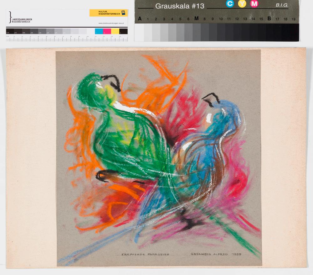 SignaturVS. li. unten bet., re. unten sign. u. dat.: "KÄMPFENDE PAPAGEIEN, GESSWEIN ALFRED 1959"