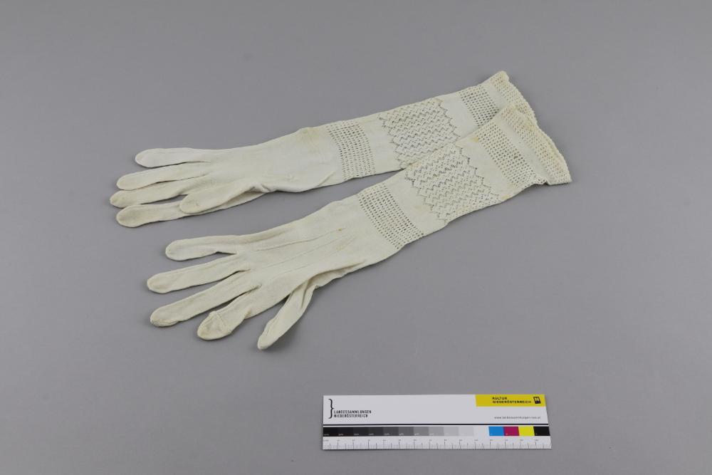 Ein Paar weiße, halblange, fingerlose Handschuhe in Ecru mit Lochmuster und dreiteiliger Aufnaht.
