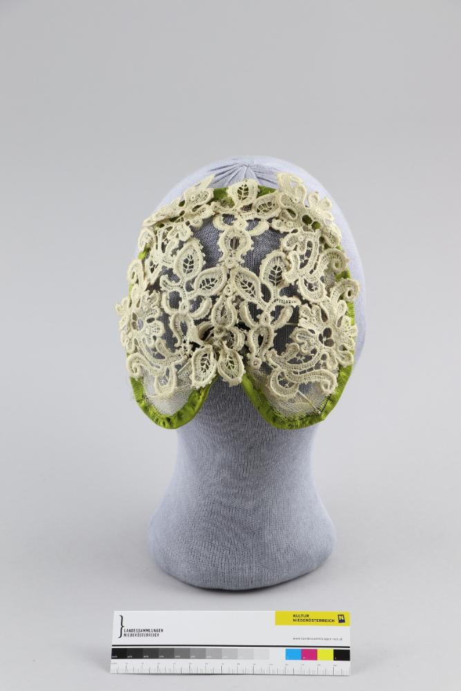 Modischer Kopfputz aus weißer Spitze auf grün eingefasstem Drahtgestell und Tüll aufgearbeitet. Firmenetikett eingenäht.