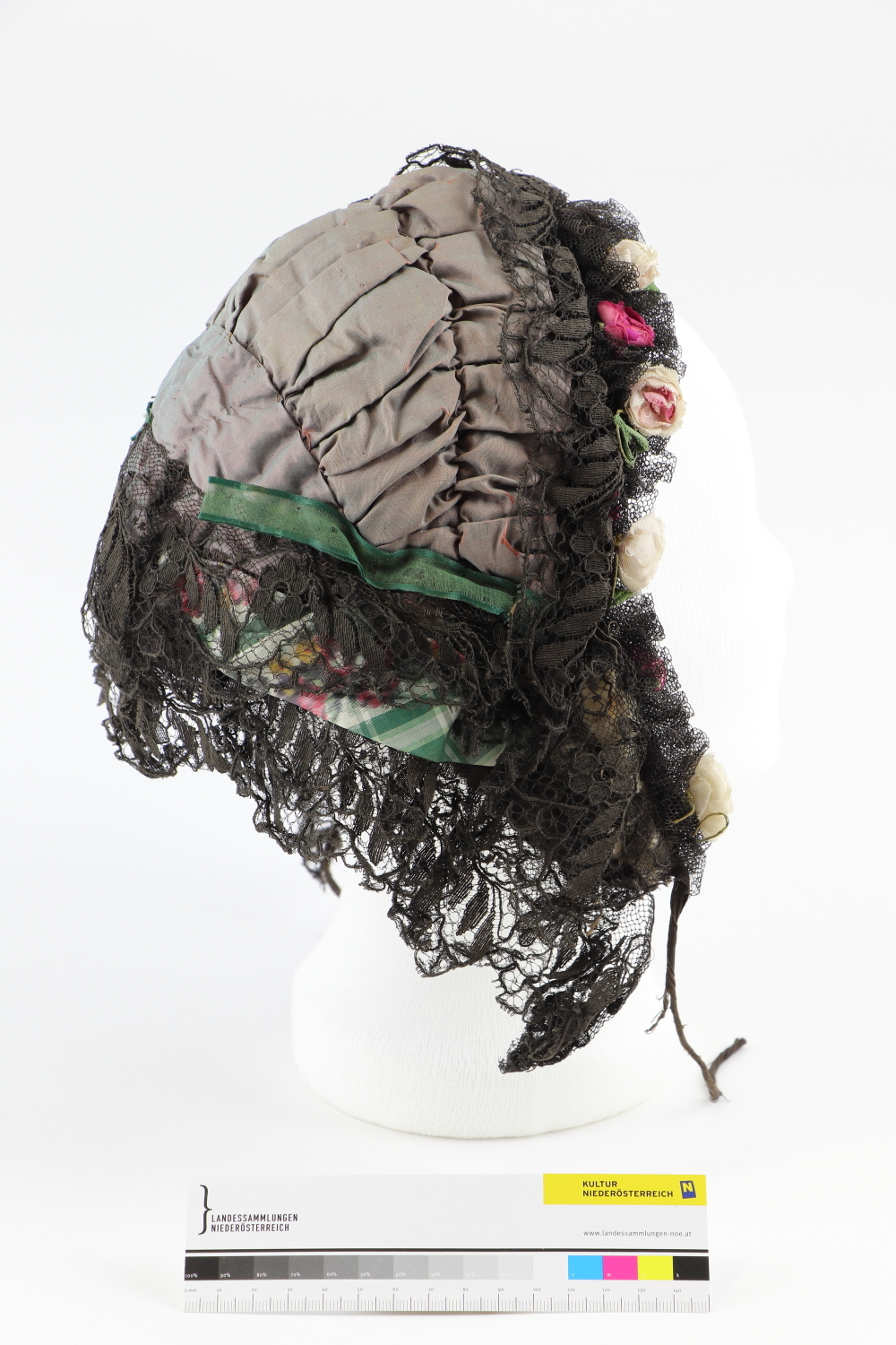 Rosa/Grün changierende Haube mit schwarzer Tüllspitze besetzt. An der Haubenkante Garnitur aus Stoffröschen mit drahtverstärkten Stängeln. Rückseitig zwei grüne Schleifen. Schwarzes wattiertes Futter.