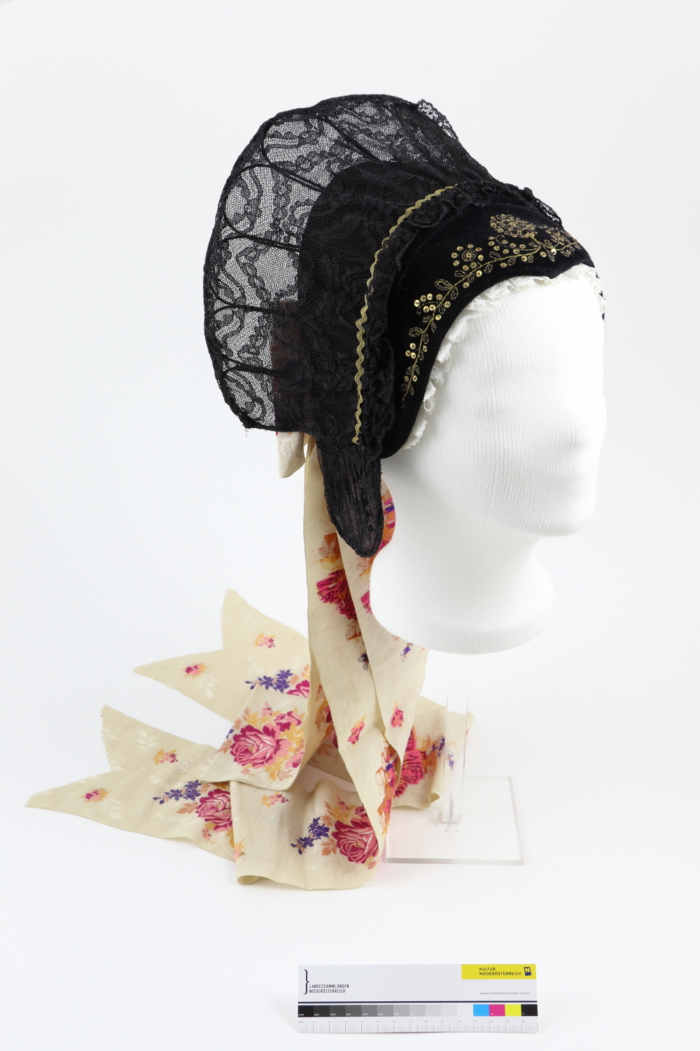 Schwarze Haube mit Pailettenstickerei auf Haubenboden und Kopfteil. Ein mit Tüllspitze überzogener Schirm ragt vom Kopfteil nach hinten und seitlich über die Ohren. Die Haubenkante ist mit einer weißern Spitzenrüsche besetzt. Im Nacken eine Masche mit langen Bändern und Schlaufe aus weißer Seide mit Blumenstäußen in Rosa/Violett/Gelb. Graues Futter.