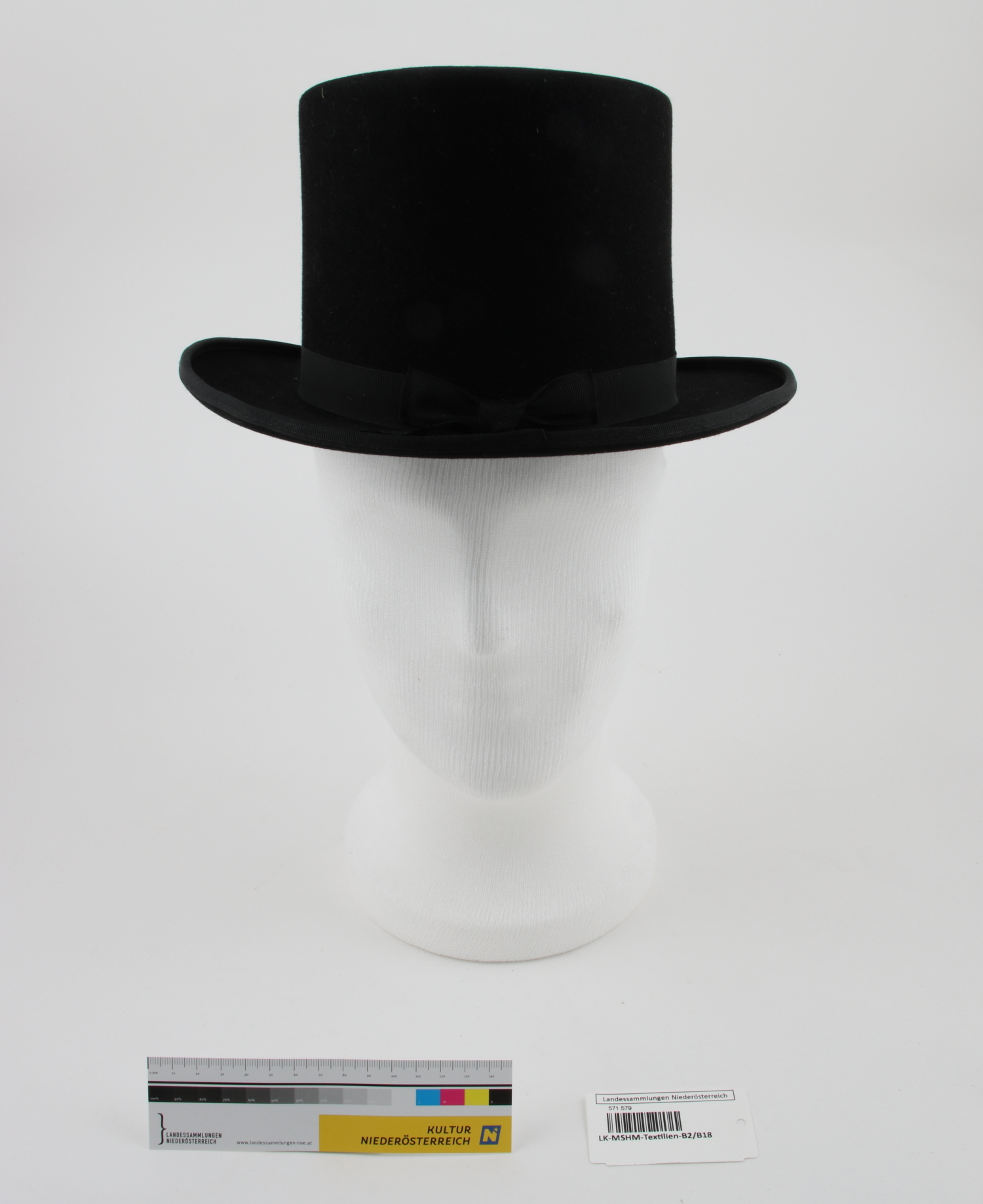 Schwarzer Zylinder mit Ripsband und rückseitiger Schleife, Krempe mit Ripsband eingefaßt, schwarzes Schweißband mit Goldprägung.