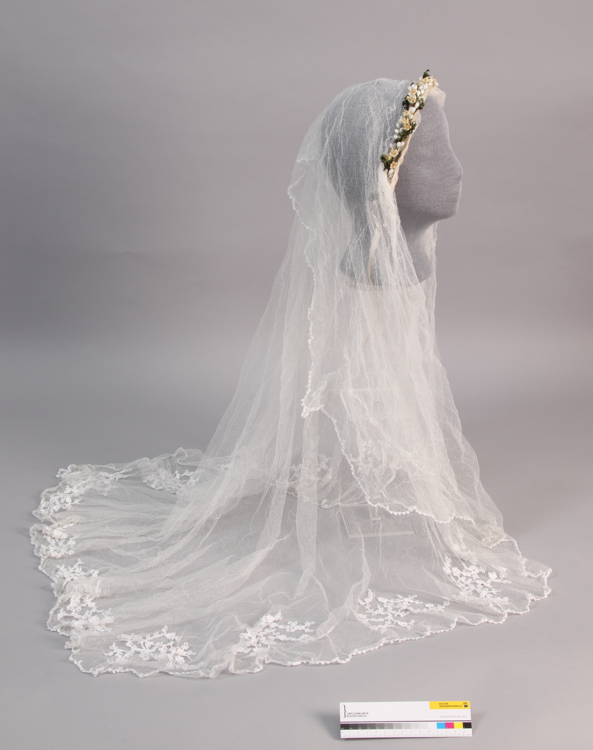 Brautschleier aus einem rechteckigem Stück Tüll, an drei Seiten mit Blumen in Kurbelstickerei bestickt. Oberkante breit umgeschlagen und durchgeheftet wo der Kranz befestigt war. Myrthenkranz aus Wachs-/Papierblumen mit geflochtenem Organzaband.