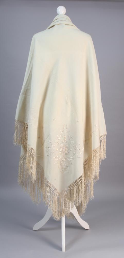 Ecrufarbenes Tuch mit langen geknüpften Fransen. Eine Ecke floral-ornamental bestickt mit Ketten-, Knötchen- und Plattstich.