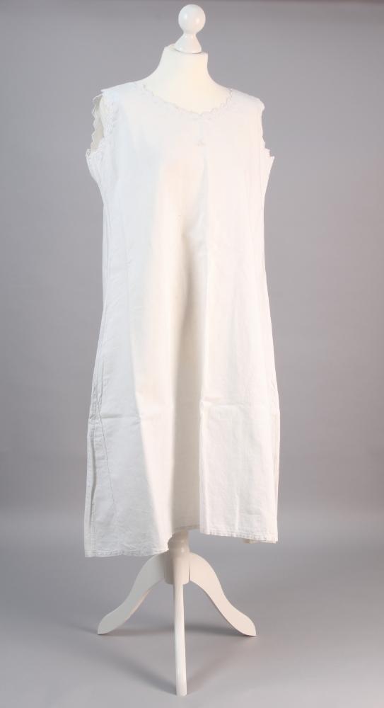 Weißes Unterkleid mit Trägern zum Knöpfen, Hals- und Armausschnitt mit Weißstickerei und geswchlungenen Kanten, Monogramm "WH".