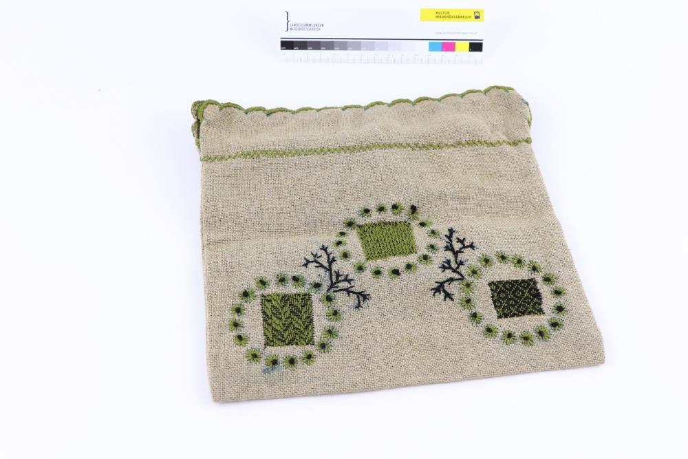 Leinenbeutel mit gebogtem Abschluß an der Oberkante, mit rosa Seidenfutter und grünem Säumchen geefüttert. Auf beiden Seiten je drei Blütenkreise mit Ästen, mittig Quadrate mit verschieden Sticharten der Leinenstickerei, in Grün und Schwarz (Übungsstück in Beutelform).