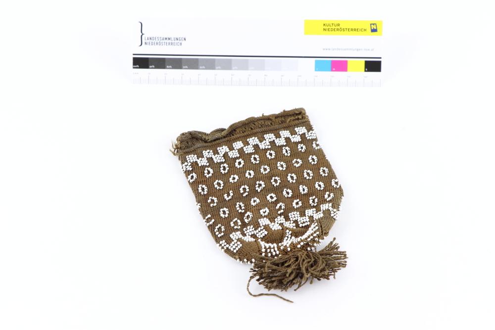 Brauner gestrickter Beutel mit weißen Glasperlen (Kreise, Quadrate) und einer Quaste am Beutelboden. Für ein Zugband sind im Eingriff Löcher eingearbeitet und von einigen verkehrt gestrickten Reihen eingesäumt. Der Beutel ist nicht gefüttert.