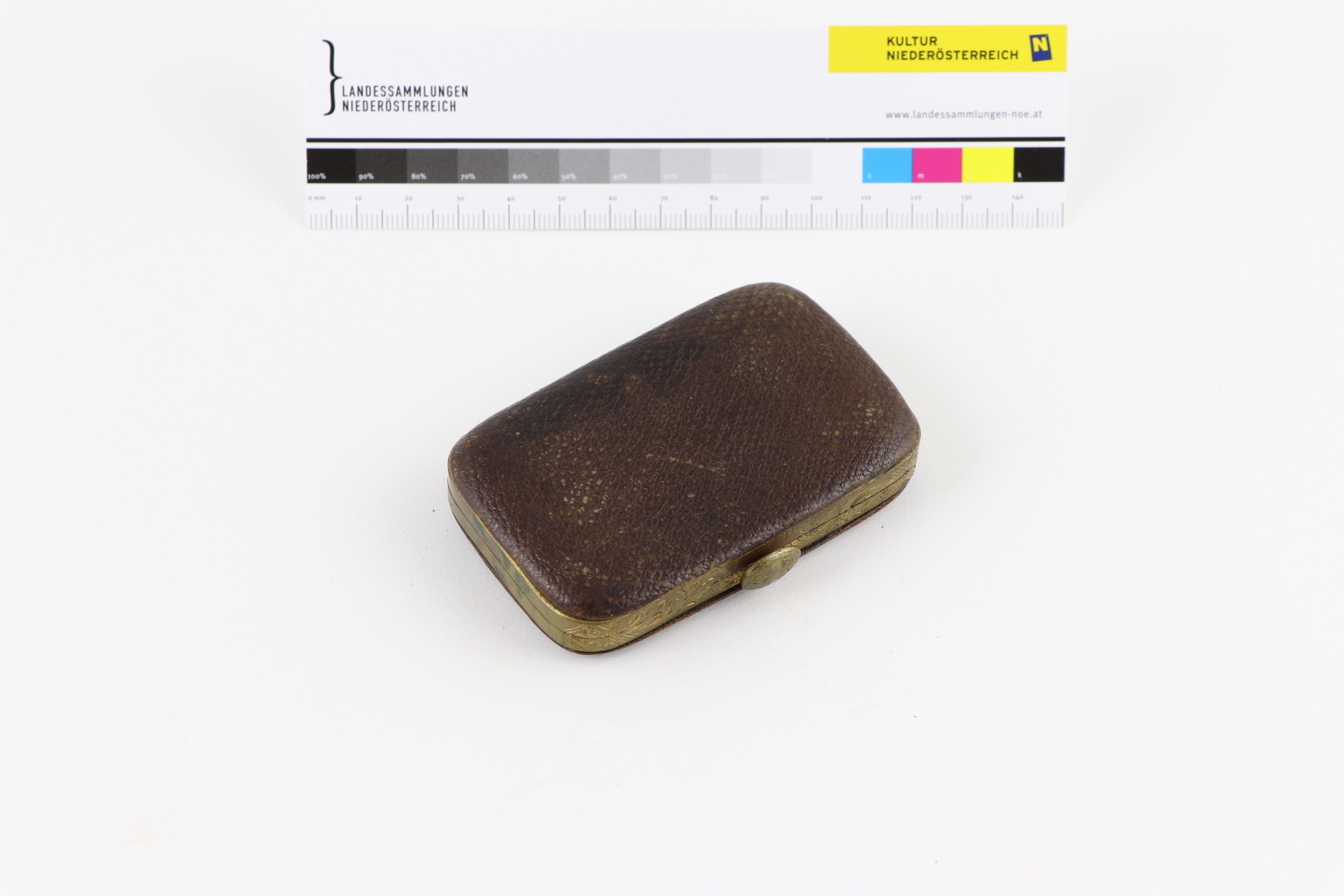 Braunes Lederetui mit Metallrahmen und -verschluß, innen fünf Fächer, davon eines mit zusetzlichem Metallverschluß (enthalten ein geprägtes Papiermarkerl mit einem Frosch). Aus blauem Seidenmoiré sind die Fächer und die Etuiinnenseiten gearbeitet, die Un