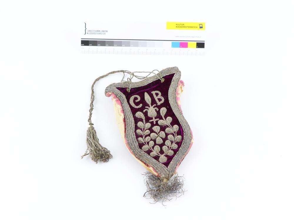 Violetter Samtbeutel mit rosa Seitenteilen, Reliefstickerei mit Kordeln und Goldbortenbesatz. Goldstickerei in Form von Blätterranken, einer Blume mit Kreuz und den Initialen "CB". Quasten an der unteren Spitze und am Zugband, das durch Ösen gefädelt ist. Futter zweilagig in Leinen- und Seidengewebe.