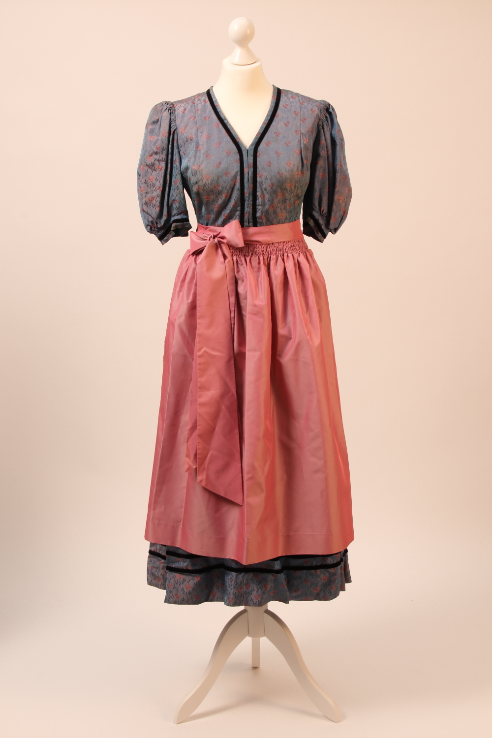 Hellblaue Tracht mit rosa Schürze. Kunstseide mit Blumenmuster in Rosa, kurzärmelig, V-Ausschnitt. Halsauschnitt, Ärmel und Rocksaum mit schwarzen Samtbändern besetzt. Vordere Mitte mit Hafterlverschluß, Oberteil mit weißem Futter, Taille und Schürze maschingezogen. Frauentracht mit rosa Schürze und Haube. Hellblau mit eingewebten rosa Blümchen. Kurzärmelig, vorn Haftelverschluß, Halsausschnitt, Ärmel und Rocksaum mit schwarzer Samtborte, Spitzeneinsatz fehlt.