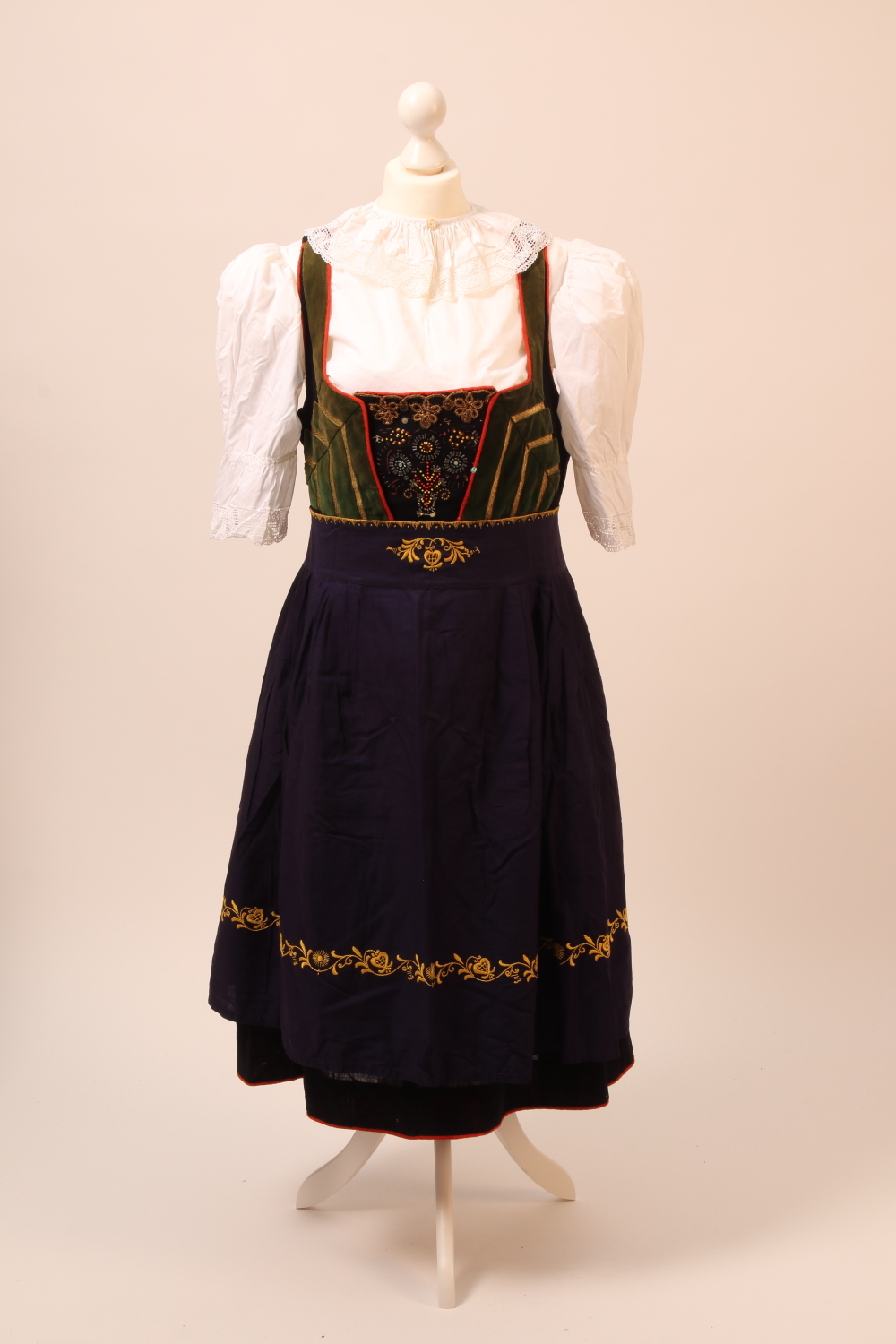 Schwarzes Miederoberteil mit Goldborten und grünen, teils gerüschten, Samtbändern besetzt, rot eingefasst, Passepoile und Besatz am Stecker. Der Stecker ist mit Blumen aus Glasperlen und Pailetten bestickt und mit einer goldenen Klöppelspitze besetzt, rückseitig bunt bestickter Einsatz aus lanciertem Goldgewebe. Haftl- und Druckerverschluß, weißes Futter. Schwarzer Wollrock mit breitem Säumchen, maschingezogen, mit rotem Kittelblech und Vorstoß. Violette Schürze mit gelben Blumenranken in Sielstichstickerei bestickt, teilweise in Falten gelegt. Weiße Bluse mit breitem Rüschenkragen, Ärmelsaum und Kragen mit geklöppelter Spitze besetzt. Im Ausschnitt Knopfverschluß, Ärmel mit Tunnelzug.