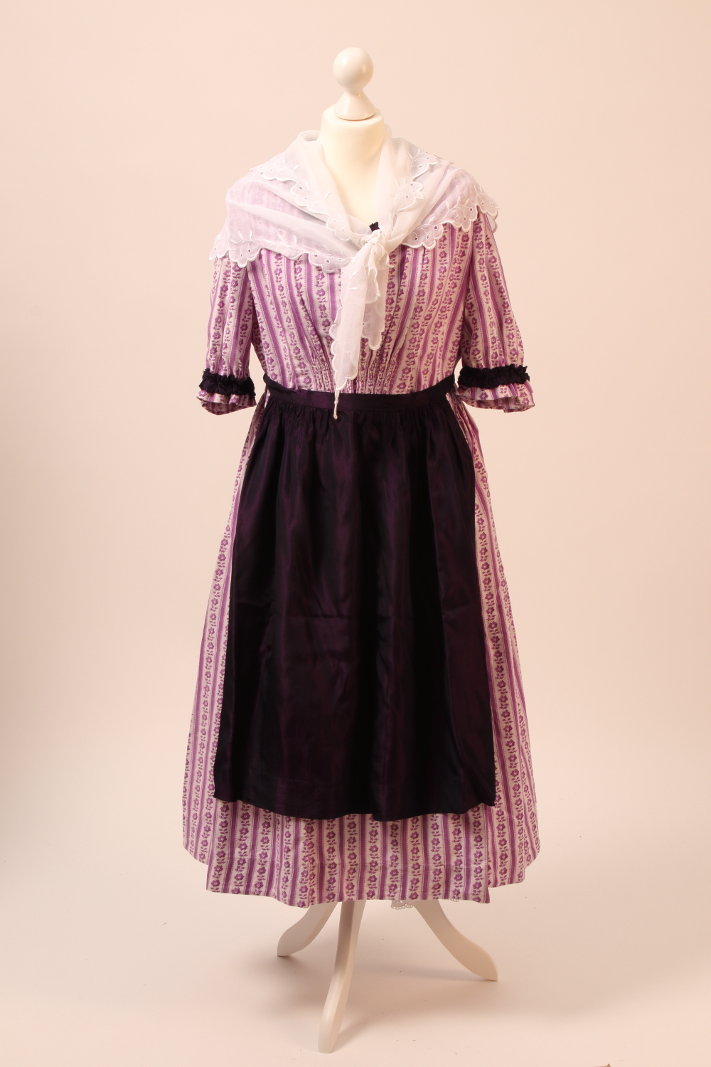 Erneuerte weiß/violett gestreifte Tracht mit violetter Schürze und weißem Schultertuch. Runder, passepoilierter Halsausschnitt mit violetter Rüsche besetzt, ebenso die kurzen Puffärmel. Vordere Mitte in der Taille und an den Schultern gerafft (Maschinzug). Vordere Mitte Haftlverschluß, Rosa Satinfutter. Schürze und Taille eingereiht, Schürzenbänder mit schwarzem Rippsband zum Binden verlängert. Weißes Dreieckstuch mit Weißstickerei.