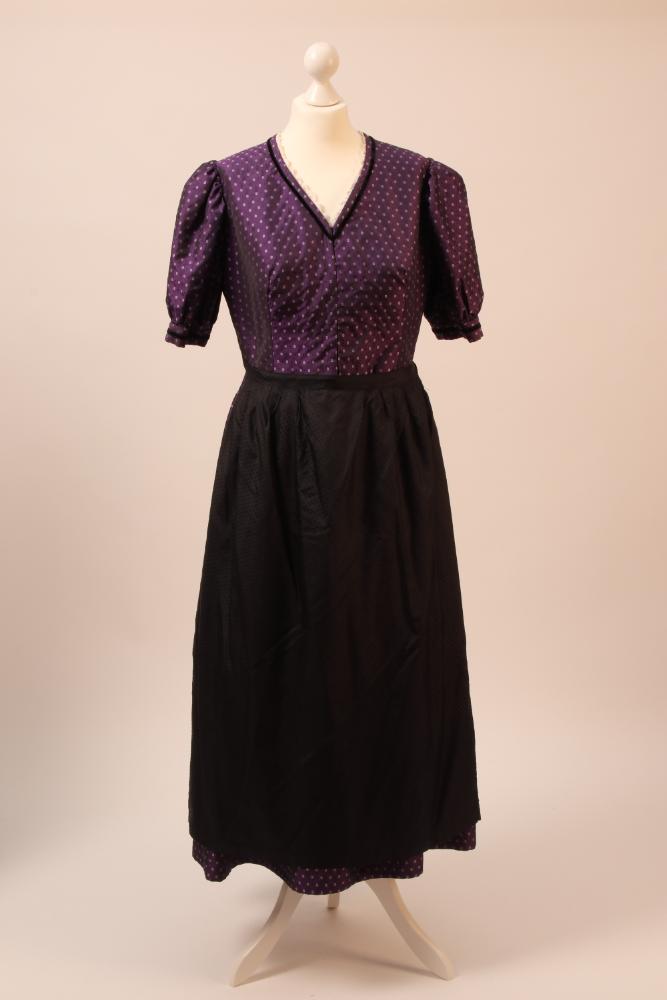 Violette Tracht mit kurzen Ärmeln, Muster aus hellviolett/gelben und schwarzen kleinen Rauten, V-Ausschnitt mit weißem Spitzenbesatz. Halsauschnitt, Ärmel und Rocksaum mit schwarzen Samtbändern besetzt. Vordere Mitte mit Hafterlverschluß, Oberteil mit violetter Baumwolle gefüttert, Taille handgezogen. Zwei schwarze Schürzen, eine in kleine Falten gelegt, die zweite mit einer schwarzen Borte als Bund, eingereiht.