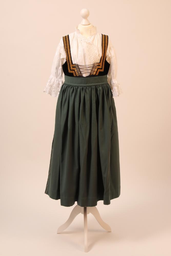 Schwarzes Miederoberteil mit Goldborten besetzt, Rückenteil mit Blumen in Gold-, Reliefstickerei mit Metallperlen und Pailetten bestickt. Im Vorderteil Metallösen mit floralem Motiv und Metallkette zum Schnüren, weißes Leinenfutter. Schwarzer Wollrock, handgezogen mit blauem Saumbesatz aus Kunstfaser. Grüne Schürze mit breitem Bund, eingereit, Webekante an den Seitenrändern. Weiße Bluse mit Stehkragen aus Batist ohne Verschluß, mit vier verschiedenen Spitzen aus Weißstickerei besetzt, Spitze an der vorderen Kante und am Ärmelbündchen in Durchbruchstickerei.