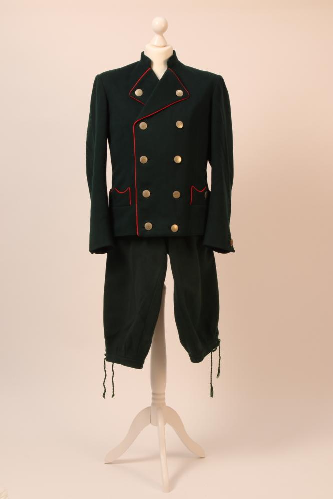 Grüne Männerjoppe, rot passepoiliert, doppelreihig mit Silberknöpfen, ein Knopf am Ärmel wurde ergänzt.