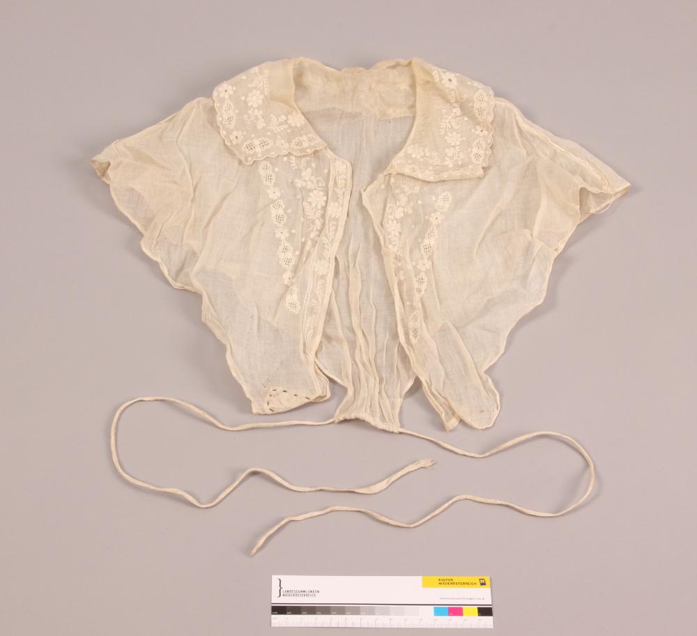 Weißer Einsatz mit Kragen mit Weißstickerei, rückseitig Tunnelzug mit Bindeband.