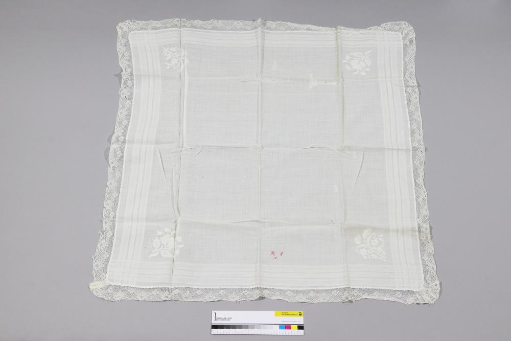 Weißes Taschentuch aus Leinenbatist mit zwei verschiedenen Blumenmotiven in allen Ecken bestickt, mit Spitze eingefaßt. Monogramm "K.A.5." mit rosa Kreuzstichen.