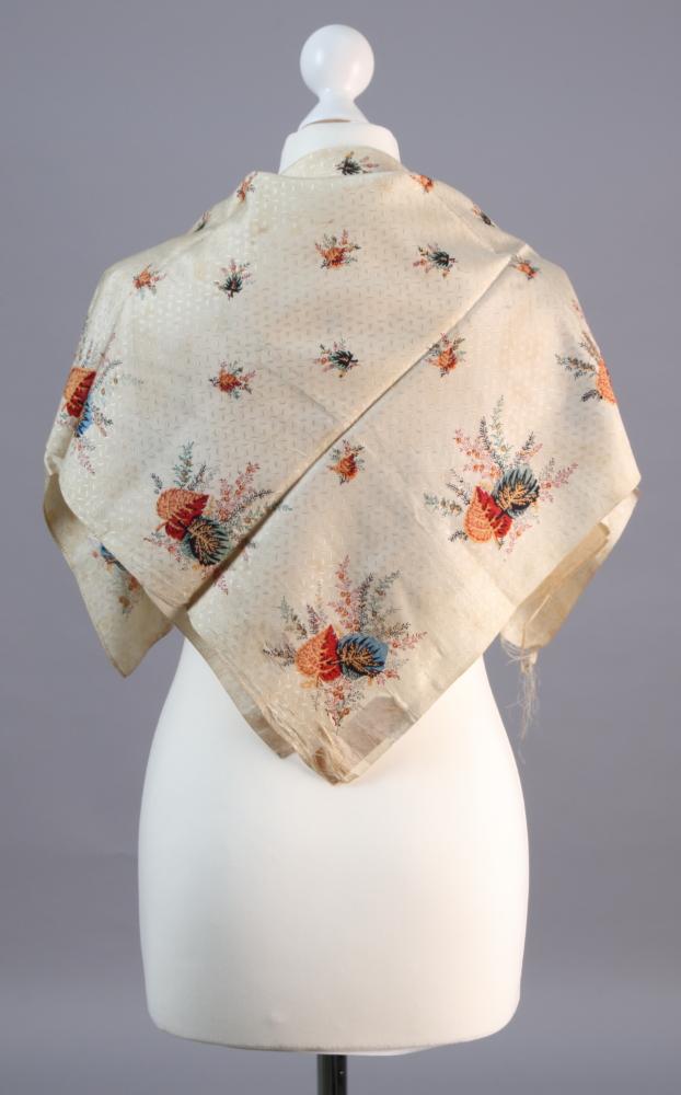 Tuch in Ecru mit in sich gemustertem Grund und bunten Sträußen aus Zweigen und Blättern. Zwei Webe- und zwei umgenähte Kanten.