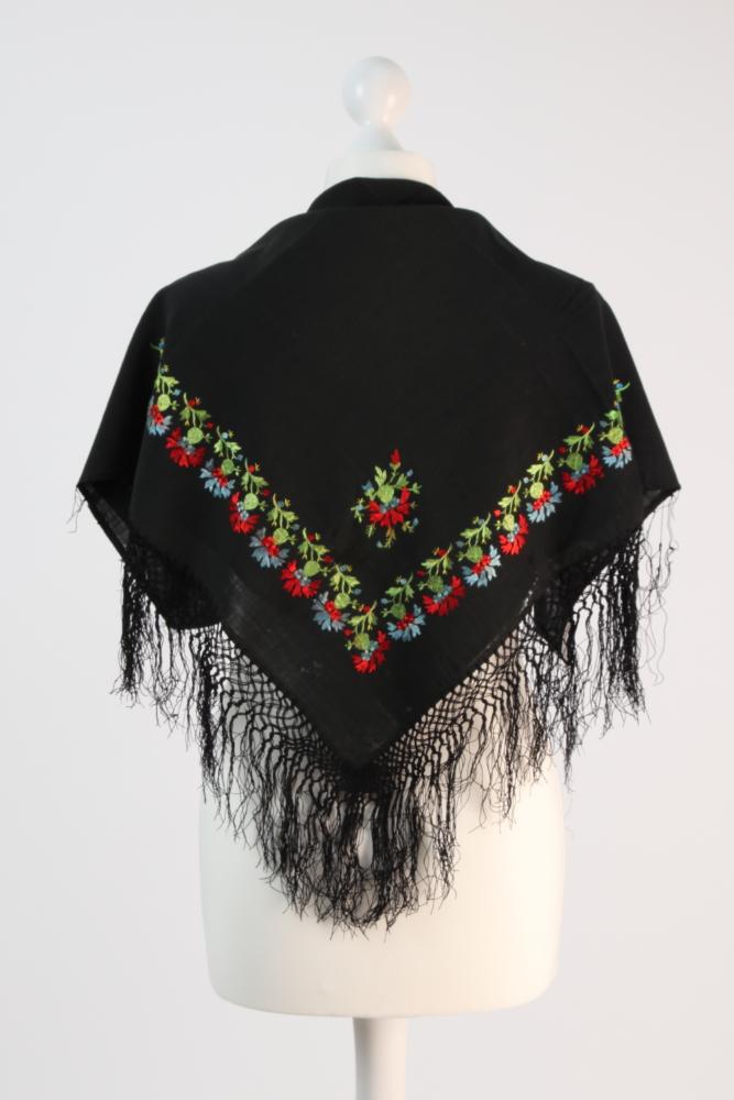 Schwarzes Tuch mit Blumenbordüre über eine Ecke und ein Eckelement in Rot/Blau/Grün. Abgesteppte Kanten mit geknüpften Fransen, bestickte Ecke mit überkreuzten Fransen.