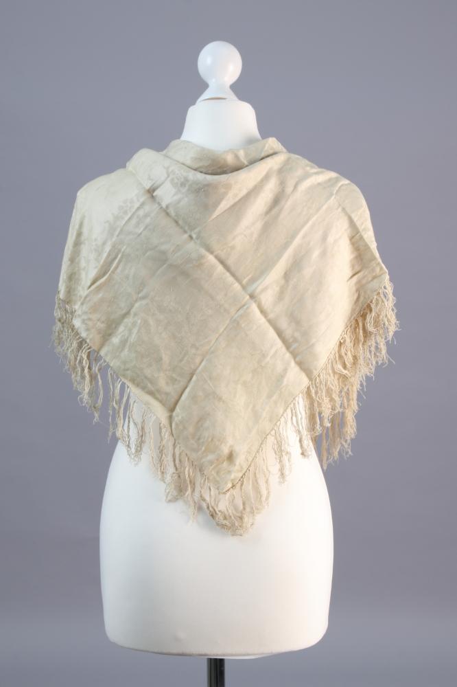 Seidentuch in Ecru mit geknüften Fransen, Blumen- und Blättermuster, mittig ein Blütenoval.