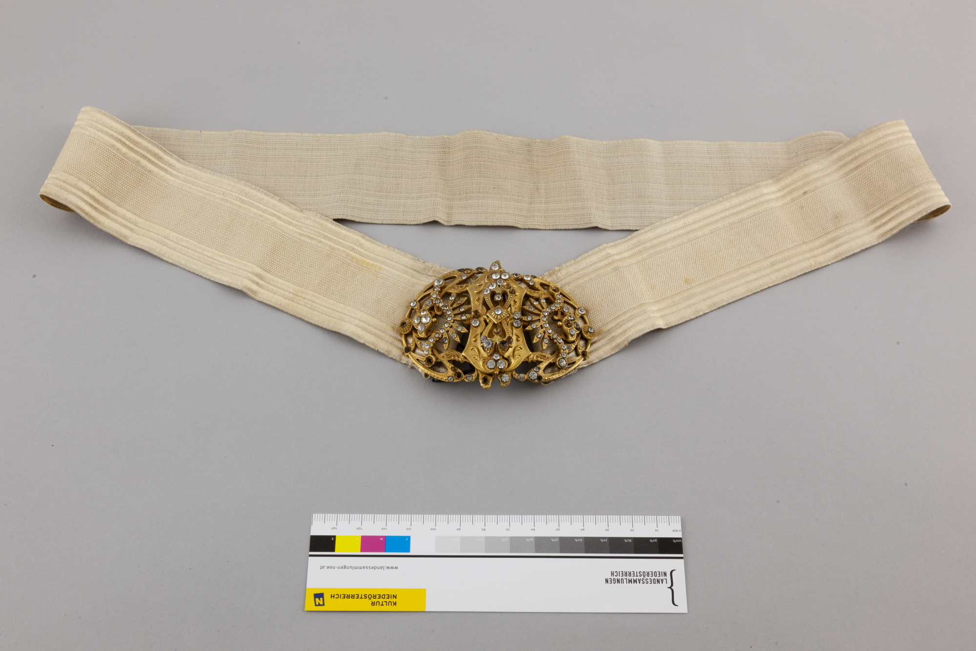 Ecrufarbener Gürtel mit ornamental gestalteter Metallschließe, mit Straßsteinen besetzt.