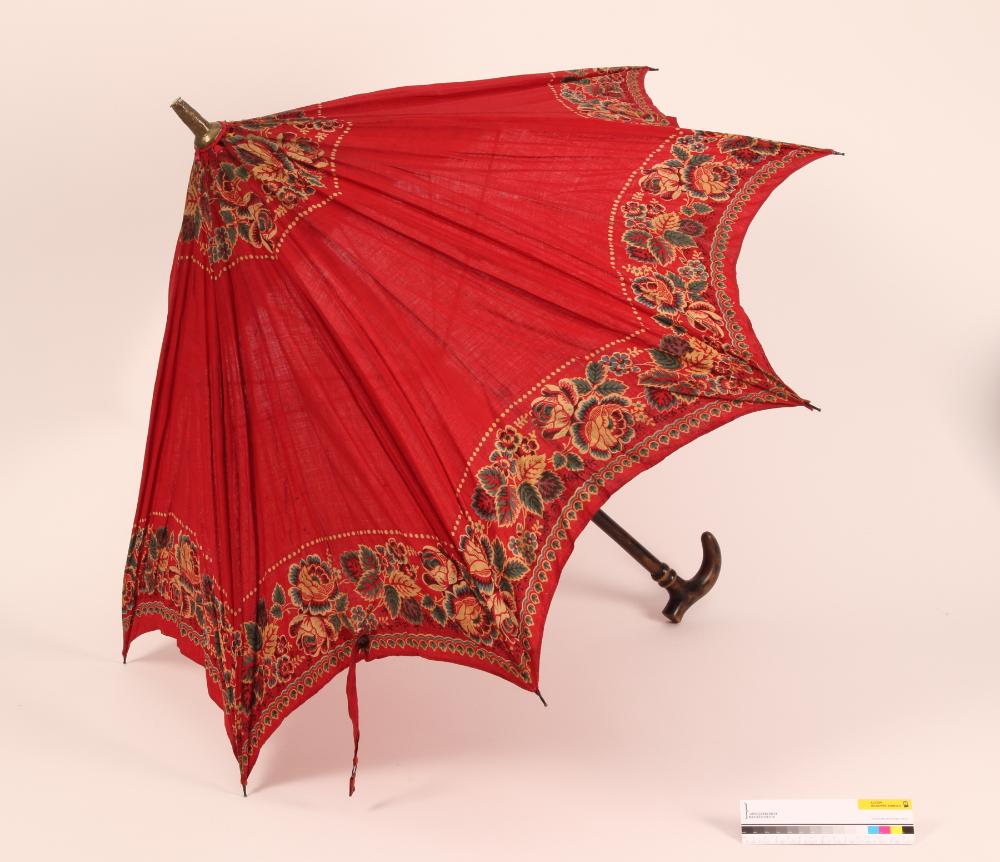 Roter Sonnenschirm mit Blumenbordüre in Blau/Weiß. Holzstock mit Fritzgriff, Schieber und Stockspitze aus ziseliertem Messing, Verschlußband mit Knopf und Ring.