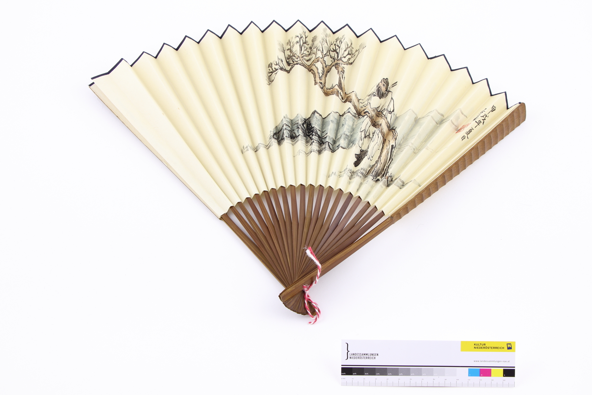 Weißer Fächer mit doppeltem Fächerblatt und Holzstäben, Deckstäbe mit geriffelter Oberfläche. Auf der Oberseite szenische Darstellung, Chinese lehnt an einem Baum, Stempel und chinesische Schriftzeichen, Oberkante schwarz eingefaßt. Dorn fehlt, mit rot/weißer Schnur zusammengebunden. Zugehörig eine Kartonschachtel mit gemustertem Deckel, geometrisch-floral in Blau/Gelb.