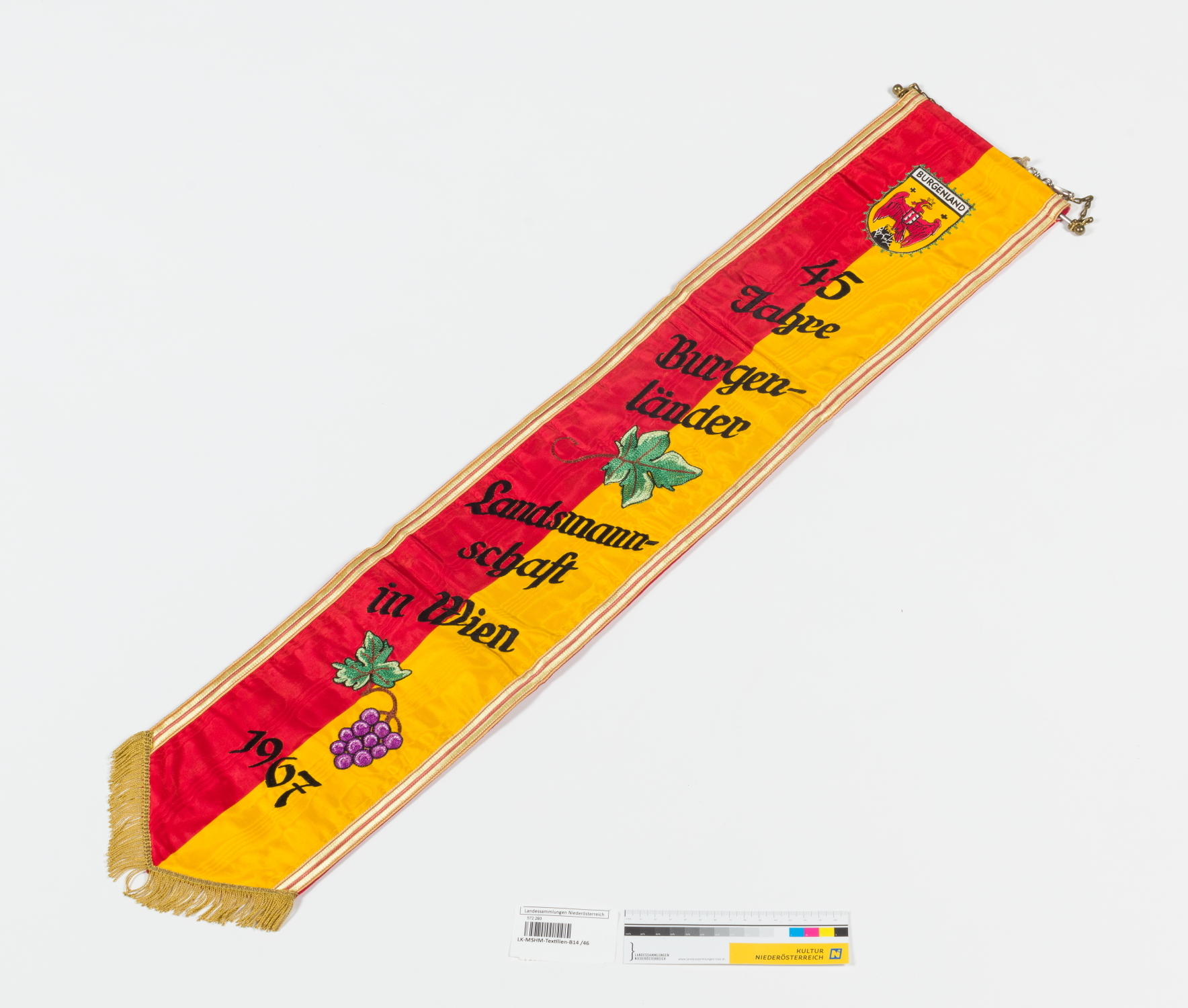 Rot/gelbes Fahnenband aus Rips-Moire-Band mit schwarzem Schriftzug, Burgenland-Wappen und Weinblättern/-trauben in Kurbelstickerei, seitlich mit Borten und Unterkante mit goldener Fransenborte besetzt. Rot hinterfüttert mit geschraubter Querstange, Kette und Karabiner für die Montage.